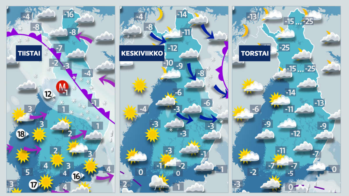 Tiistaina aamulla Länsi-Suomessa sataa vettä, räntää tai lunta. Päivällä idässä ja pohjoisessa sataa lunta.